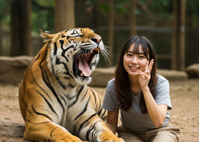 虎との写真撮影については、特にオランウータンなどの他の動物との撮影と異なり、大人の虎とは直接触れることができません。