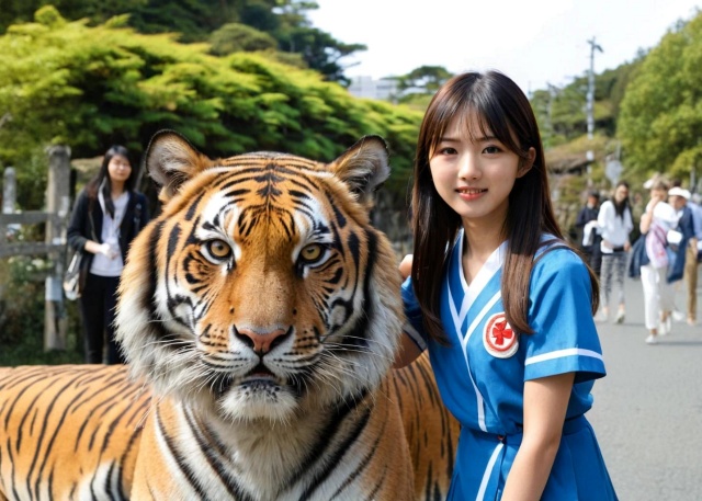 - 安全管理のもと、虎と一緒に写真撮影を行います。